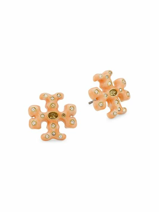Sculpted in the shape of the label’s signature Double-T logo, Tory Burch’s Roxanne stud earrings are crafted of goldtone brass and colored resin embellished with sparkling glass crystals.