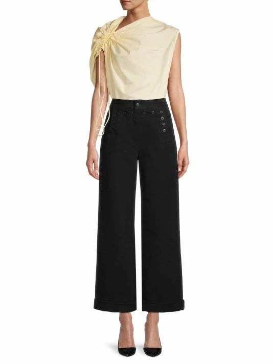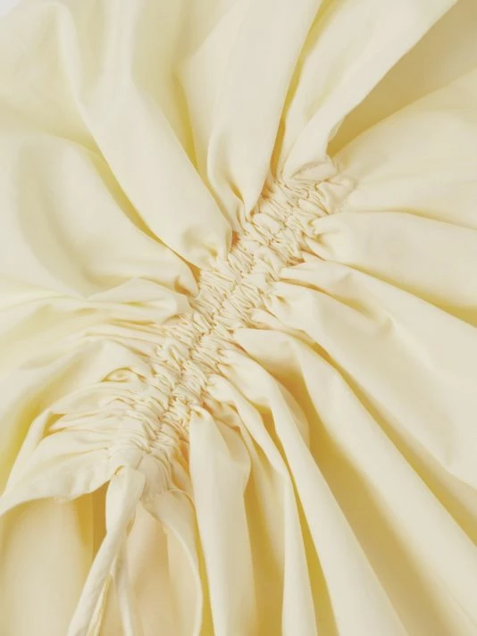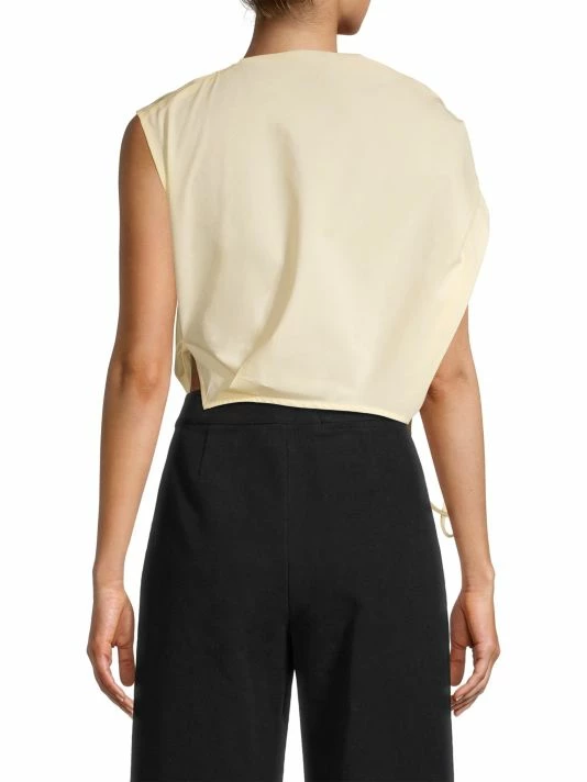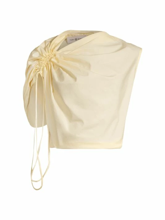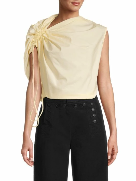 This sleeveless poplin top is defined by an adjustable, asymmetric ruched neckline.