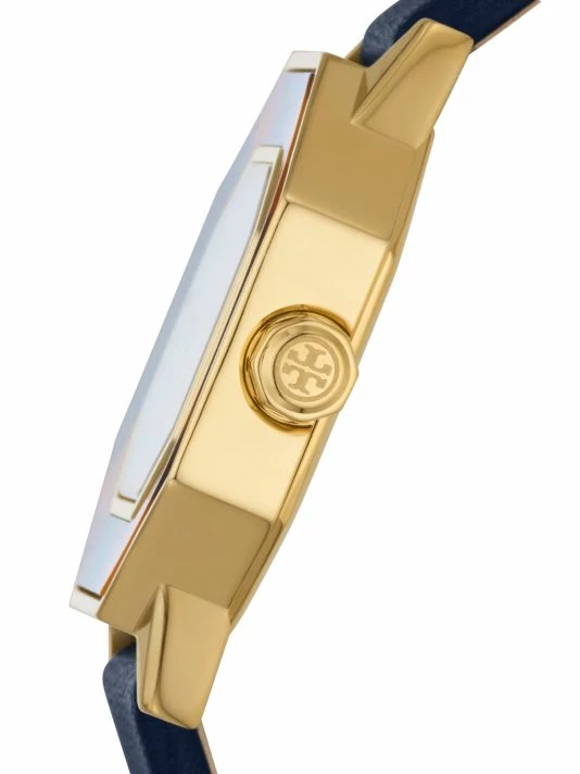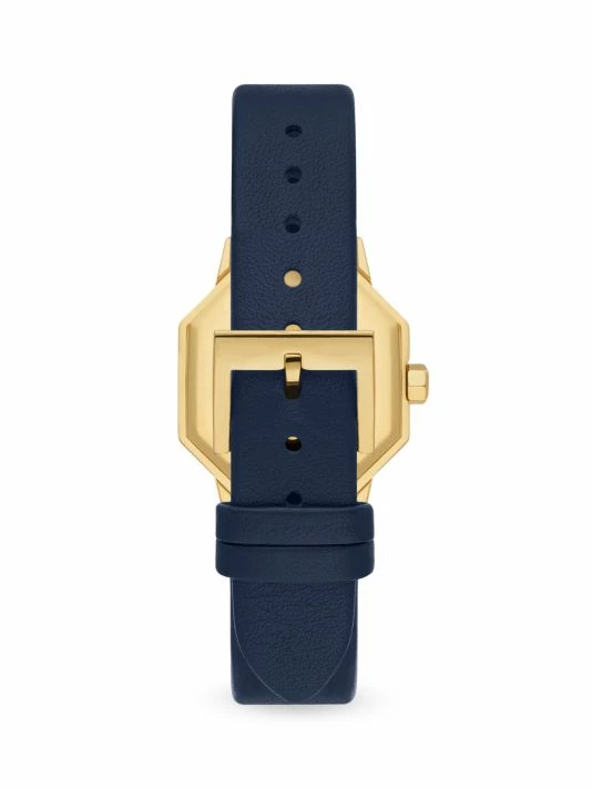 From the Sawyer Collection. Crafted of goldtone stainless steel, Tory Burch’s Sawyer watch features an octagonal case, cream dial, and tortoiseshell acetate bezel. This refined accessory secures with a navy leather strap.