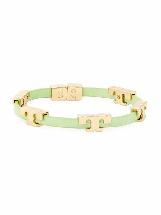 Made of black leather, this chic bracelet is adorned with Tory Burch’s signature goldtone logo hardware.