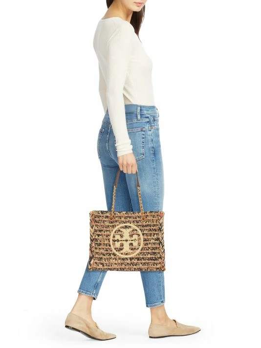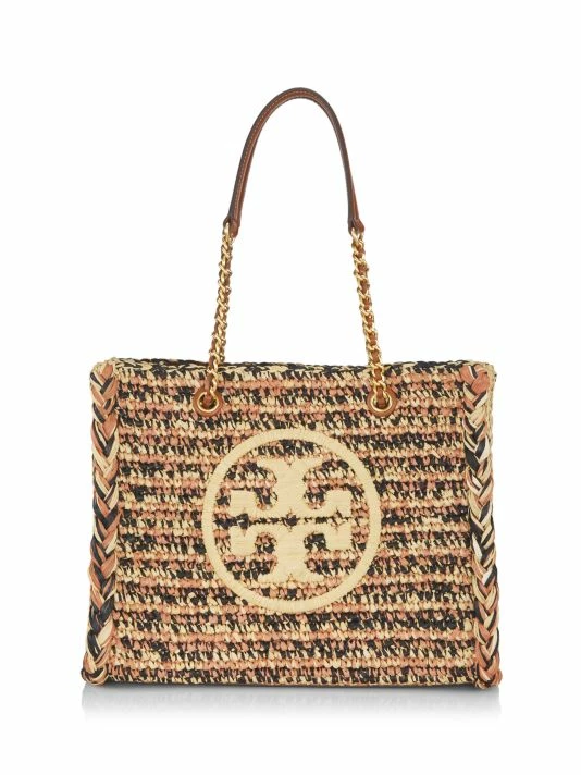 A perennial favorite, Tory Burch’s Ella tote is designed in a woven raffia construction highlighted with the signature Double T logo. This piece is accompanied by two chain straps.