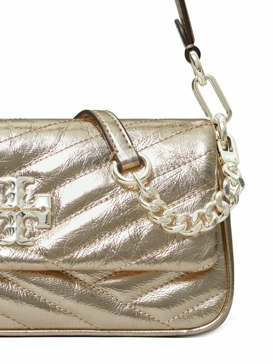 From the Kira Collection. Tory Burch’s Kira shoulder bag is crafted of chevron-quilted metallic leather. Accompanied by a sleek chain strap, this slim silhouette is highlighted with the New York City-based label’s signature Double T logo.
