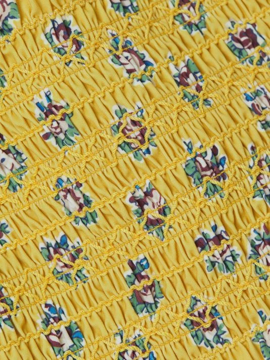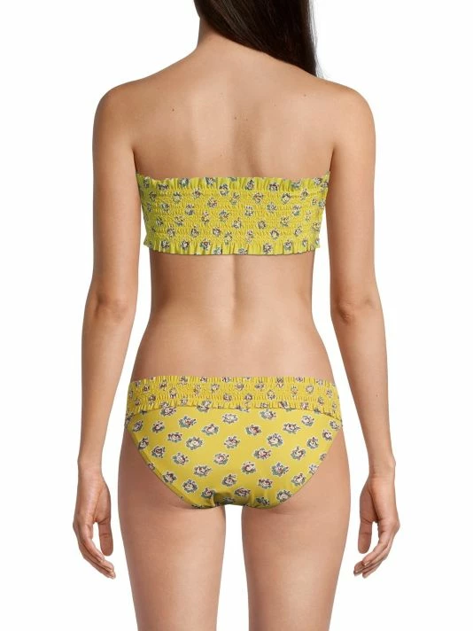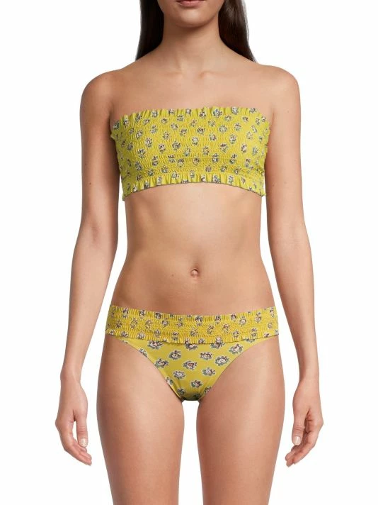 Tory Burch’s smocked Costa bandeau bikini top is defined by a micro floral print.