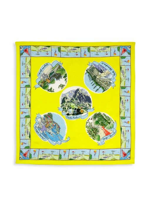 Crafted in silk twill, Tory Burch’s Souvenir scarf boasts a graphic border, capturing the spirit of summer travel with pictures of sailboats and sandy beaches.