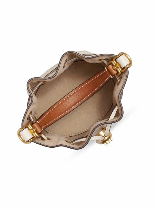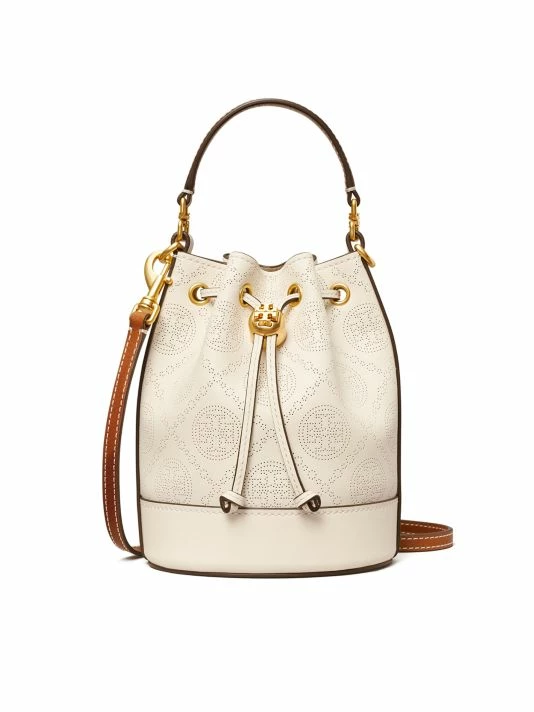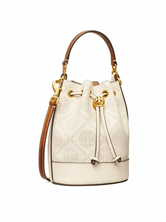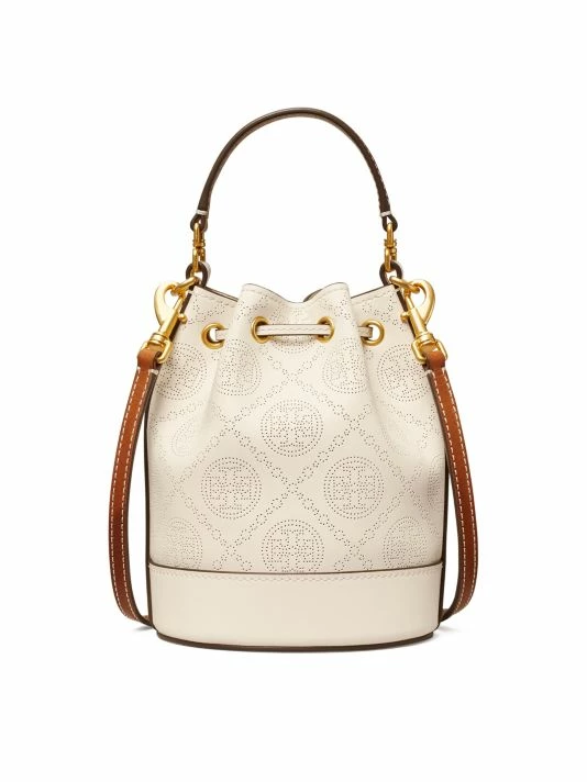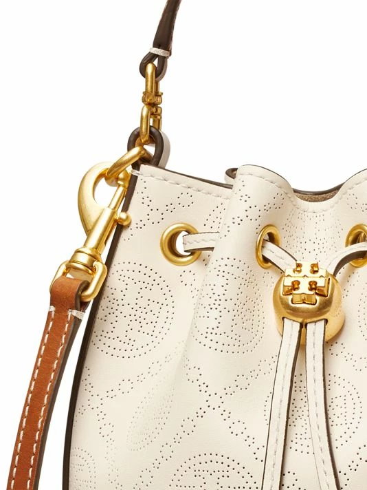 This leather bucket bag is adorned with a perforated monogram pattern with a goldtone Double T cord stopper at the closure.