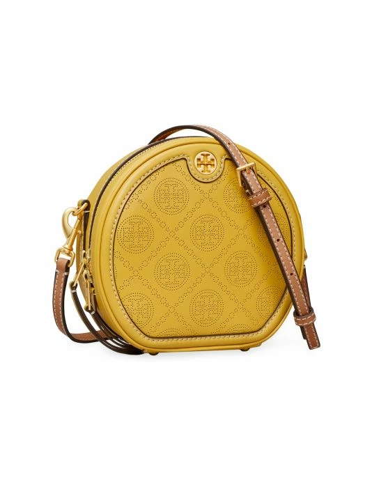 From the T Monogram Collection. Adorned with Tory Burch’s Double T-logo hardware, this petite moon bag exudes a timeless elegance. Crafted of T-monogram perforated leather, this piece is finished with a removable crossbody strap.