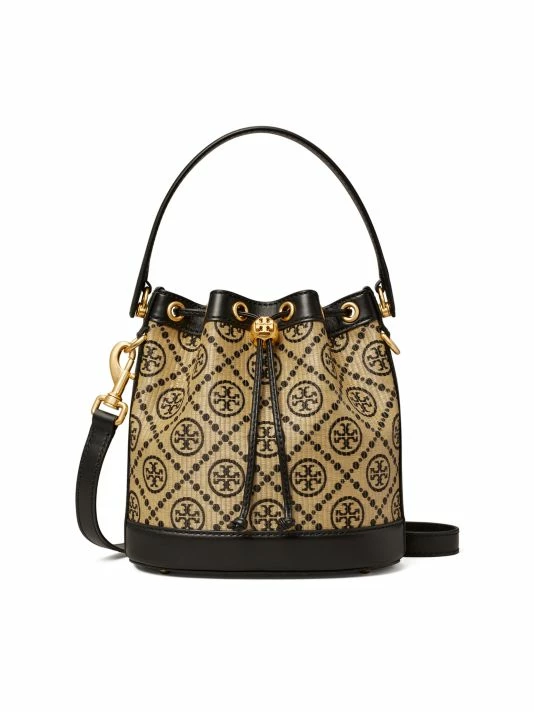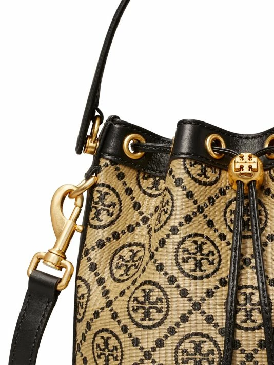 Tory Burch’s bucket bag is meticulously crafted in a soft woven fabric made to look like raffia and trimmed in fine leather.