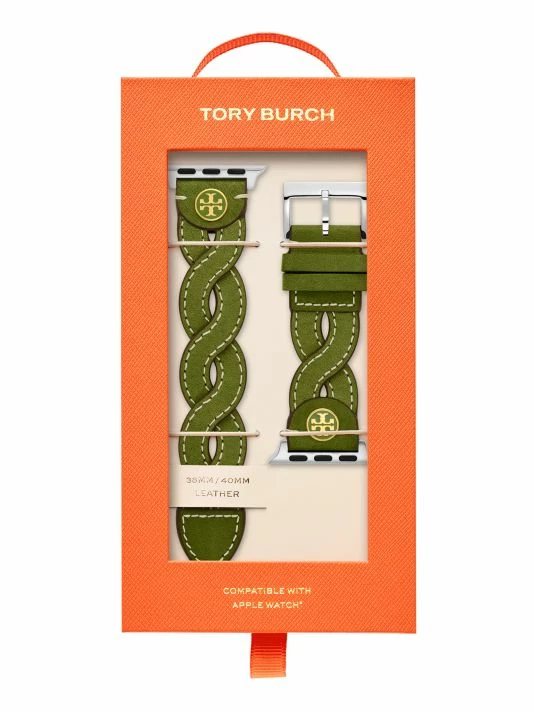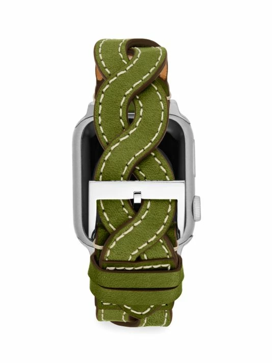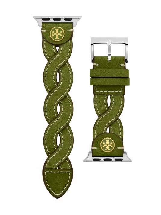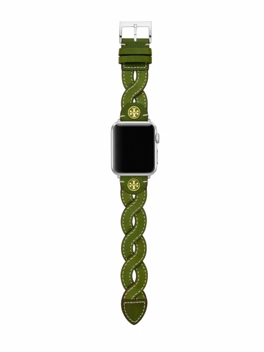Tory Burch’s braided leather band made for Apple Watch® features a stainless steel buckle closure. Apple Watch is a trademark of Apple Inc.