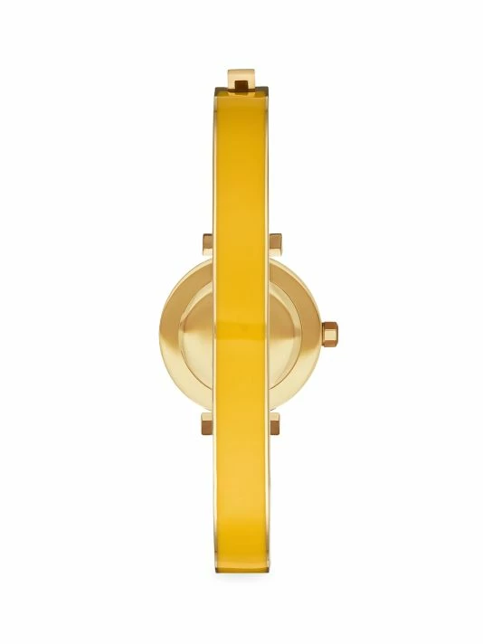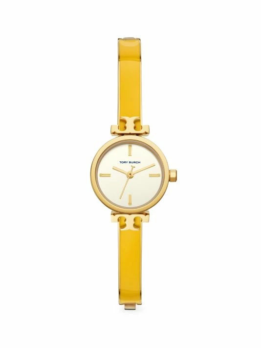 From The Kira Collection. Tory Burch’s slim 22mm watch features a white glossy dial with gold-tone indexes, t-logo lugs, analog movement and gold-tone stainless steel bangle with yellow enamel.