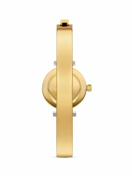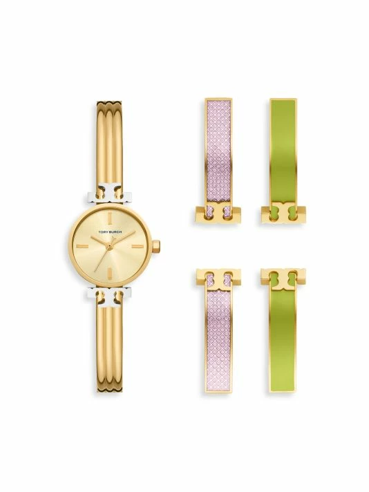 From the Slim Collection. This stunning watch gift set features an analog dial with interchangeable goldtone, purple, and green bangle inserts for a personalized touch.