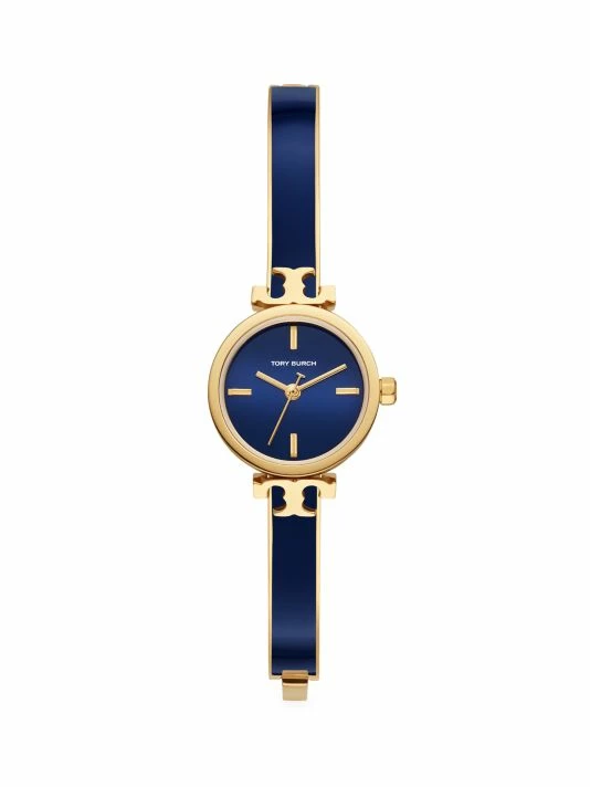 From The Kira Collection. A watch to wear like jewelry, The Kira features a rounded goldtone sterling silver case detailed on either side with signature T, a glossy navy dial, and a delicate bracelet in goldtone stainless steel with navy enamel.
