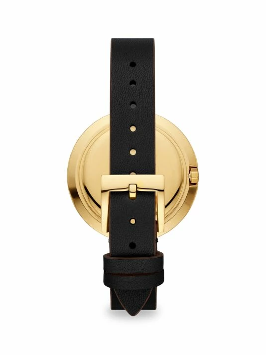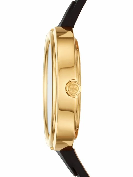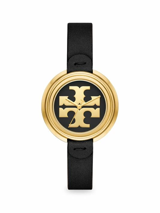 Elegant and iconic, the Tory Burch logo is the star of this stainless steel watch featuring a polished goldtone case and a slim band in textured black leather.