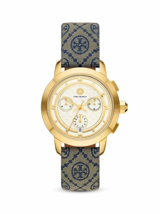 Made in Japan, Tory Burch’s Tory watch is crafted of goldtone stainless steel. It features an ivory dial set on a monogram T jacquard strap trimmed with leather.