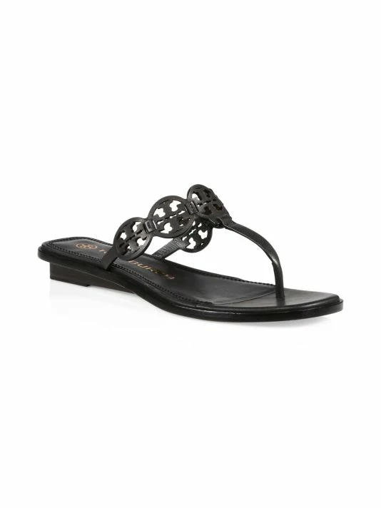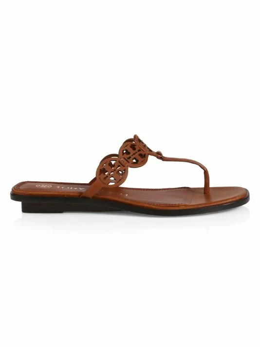 Refined leather thongs on a slight wedge finished with miniature logo medallions along the vamp.