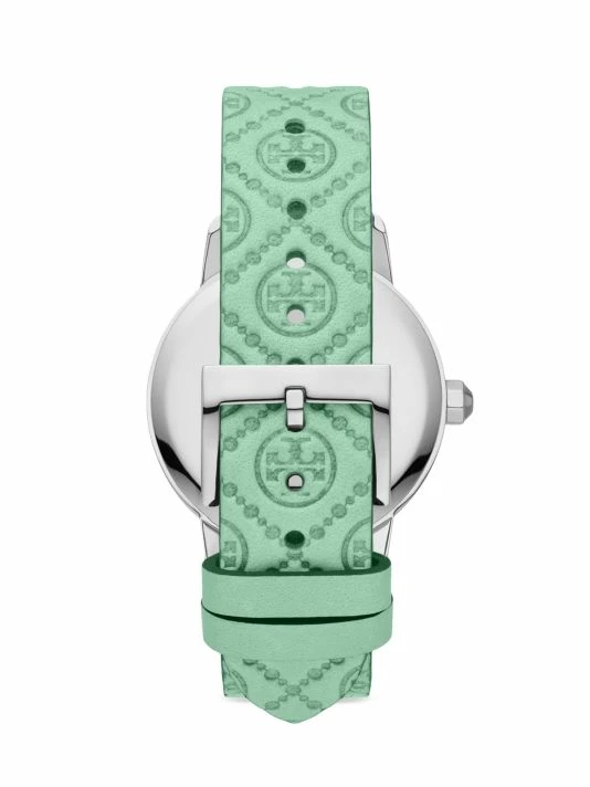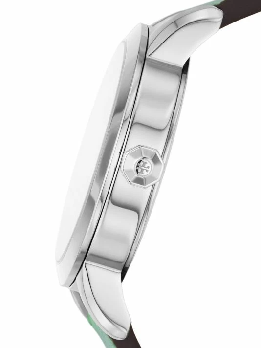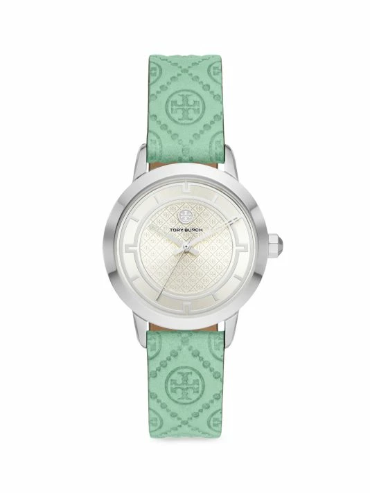 From the Tory Collection. Tory Burch’s Tory watch boasts a round stainless steel case and cream dial. Made in Japan, this chic accessory secures with a light green leather strap debossed with the label’s signature Double T logo.