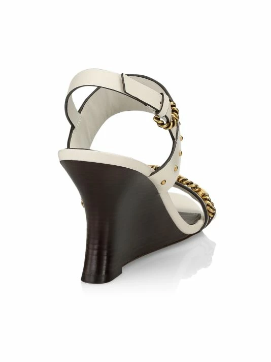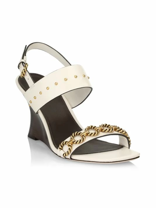 Vintage chainlink hardware and polished studs adorn the vamp straps of Tory Burch’s sandals. Crafted of rich leather, this pair is elevated by a curved wedge heel for a sculptural touch.